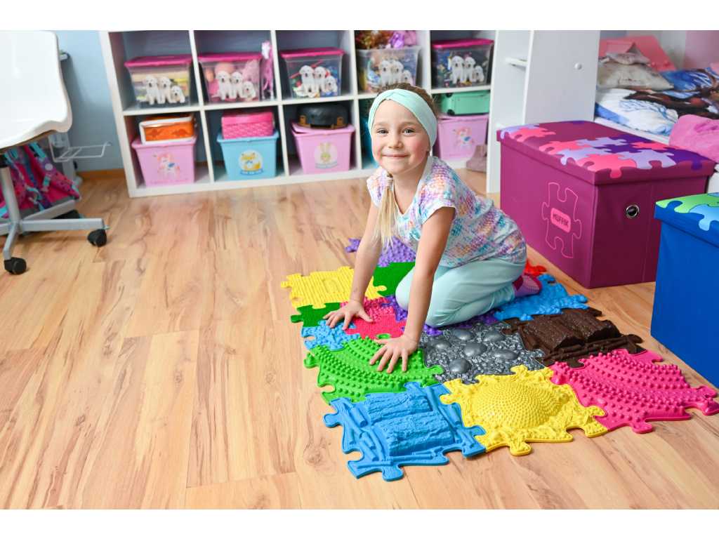 Das Profi Set – 1 besteht aus Basic Set – 1 und 3D Erweiterungsset und bietet somit eine perfekte Kombination aufeinander abgestimmten Modulen mit weichen und harten Oberflächen. Die Module mit harten Oberflächen wie Zapfen und Nüsse stimulieren und stärken das Fußgewölbe. Durch den angenehmen Reiz werden wenig ausgeprägte Muskeln aktiviert und gestärkt. Weiche Oberflächen wie Gras und Dino Eier stimulieren und massieren die Füße sanft.